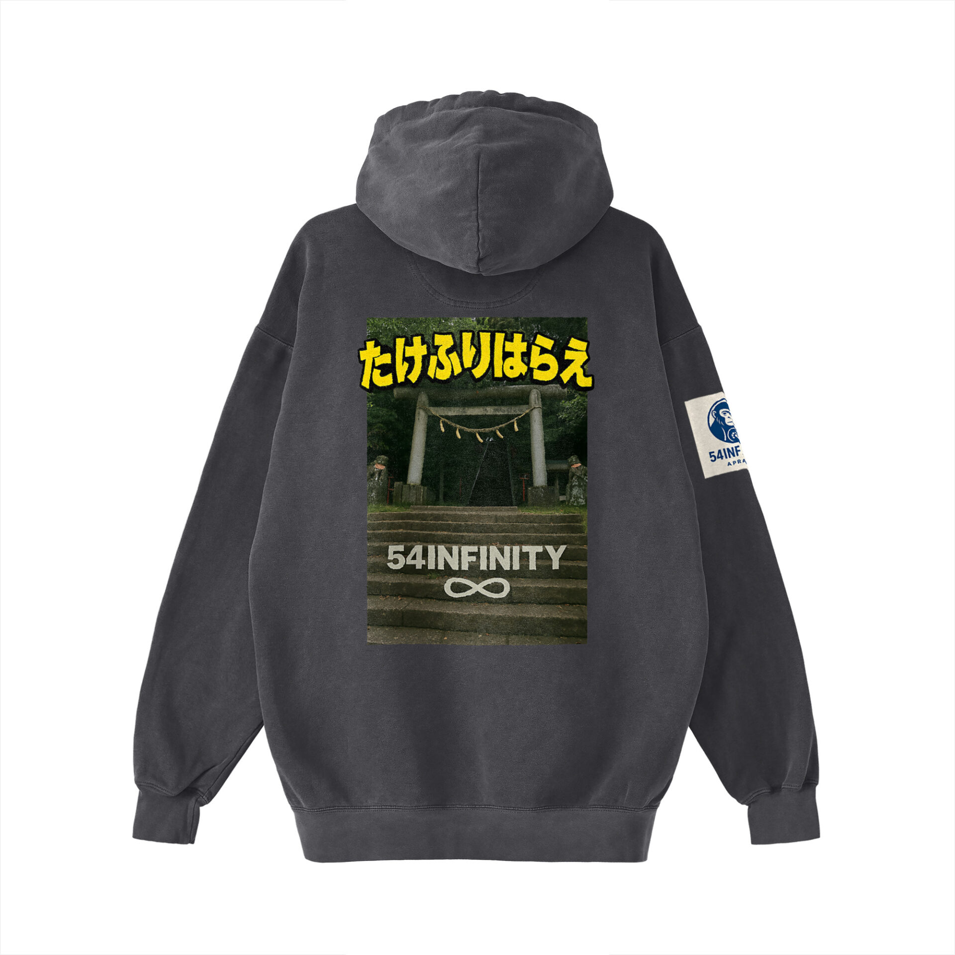 表にウガジン、背中に4つの国の島にあるタケミカヅチの尊を静かに祀る鳥居を配置し、勝負に負けないパーカーが完成。 身幅にゆとりがあるアメリカンスタイルのプルオーバーパーカーです。 色染めの後に洗い加工を施しており、ヴィンテージ感が楽しめます。