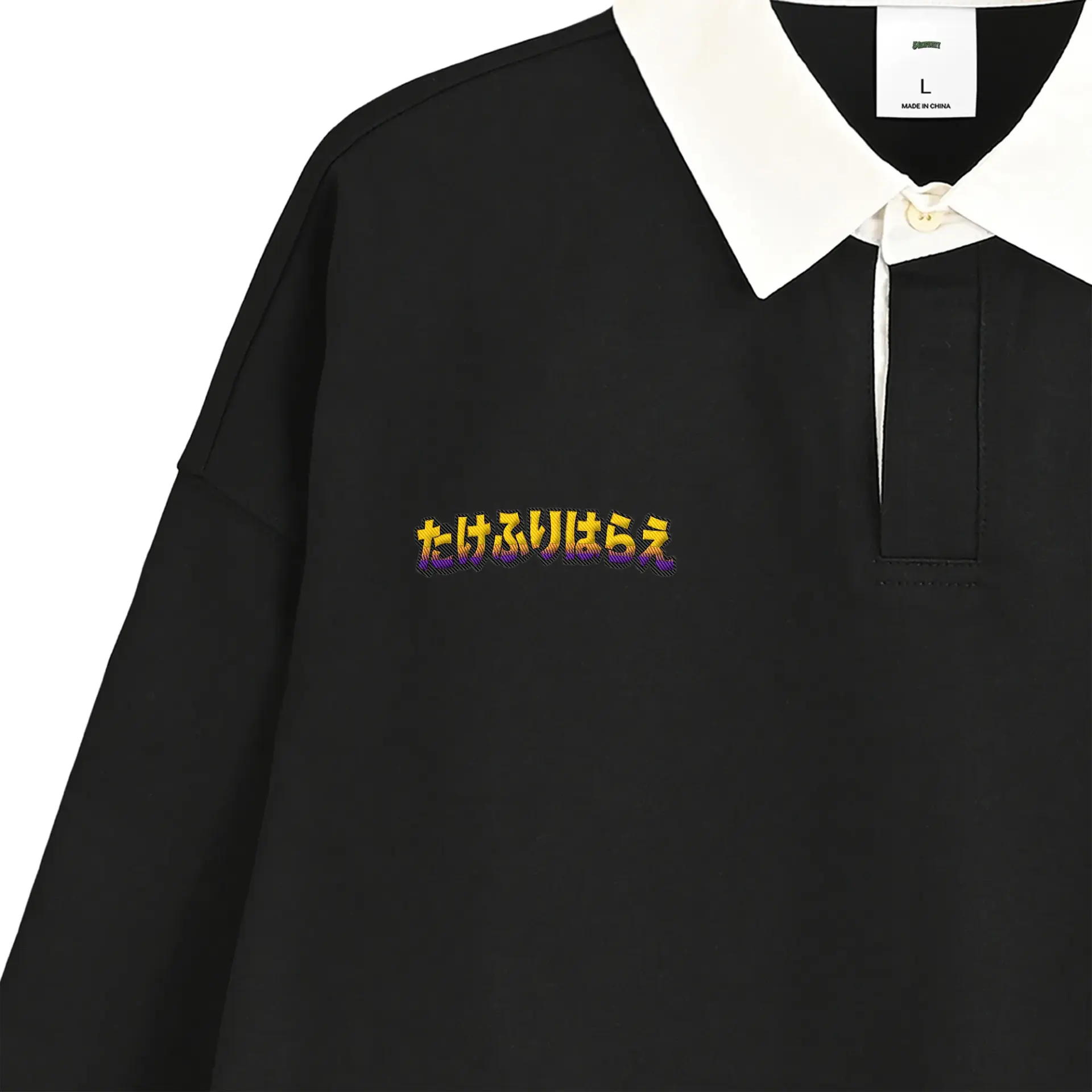 最強の言霊ロゴを刺繍。背中には修行岩に掘られた烏天狗。